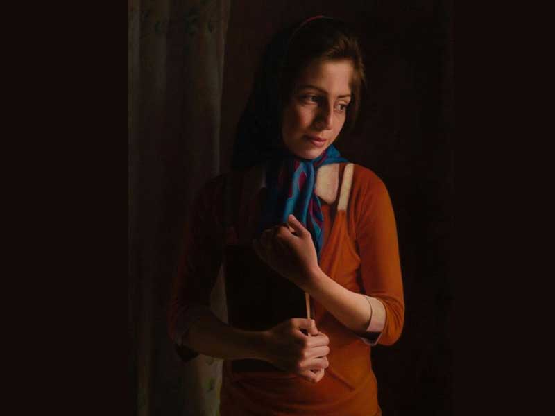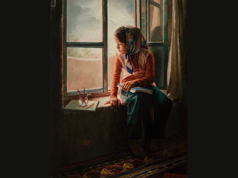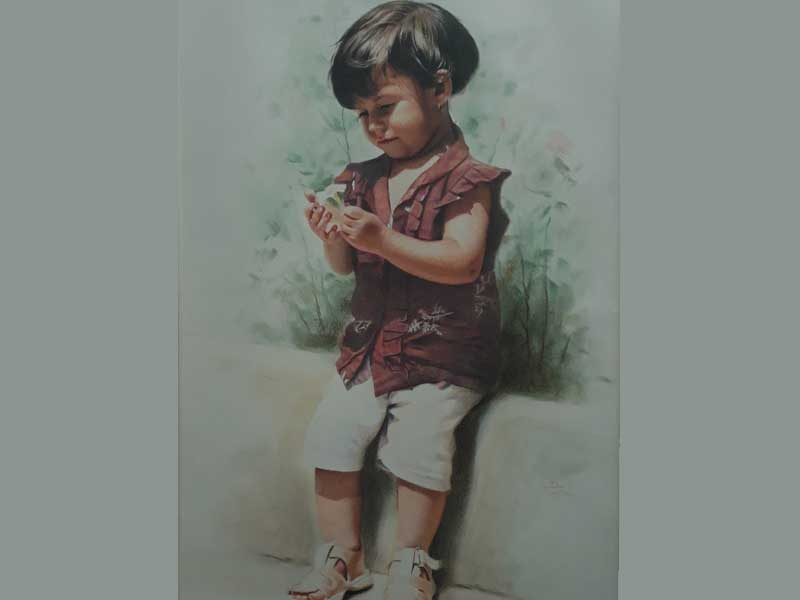 نقاشی با مداد رنگی با سبک رئال روی مقوای تیره